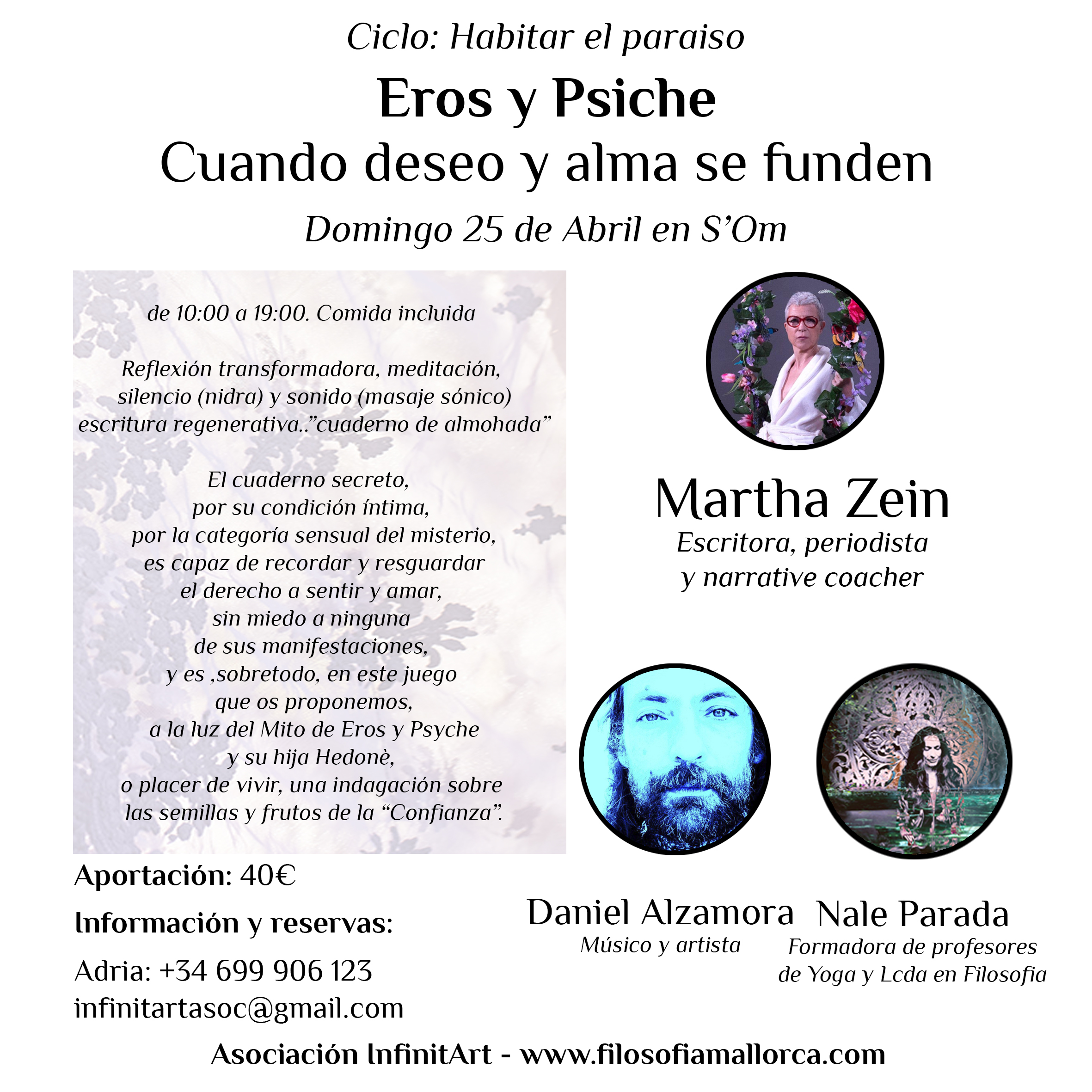 A través de juegos poéticos, reflexiones, actos conscientes, respiraciones profundas, prácticas psicofísicas y energéticas, propuestas meditativas y de autoindagación experiencial, silencios y sonidos que acarician el aire y la piel, cada persona retratará su paraíso interior en su particular cuaderno de viaje interior: “cuaderno de almohada”. Los cuadernos de almohada eran pequeños cuadernos secretos eróticos japoneses, que en esta propuesta inspiran la sutilidad del erotismo más profundo y espiritual que palpita en cada instante de nuestras vidas: cuando nos damos cuenta de que el saborear todas las emociones de la vida y dejarnos tocar y acariciar por ellas. Eros puede manifestarse no sólo con el hecho de intentar esculpir palabras en el aire, dibujar radiografías de deseos, hacer collages con sueños, coser las ganas, cortar palabras de amor… El cuaderno secreto, por su condición íntima, por la categoría sensual del misterio, es capaz de recordar y resguardar el derecho a sentir y amar, sin miedo a ninguna de sus manifestaciones, y es ,sobretodo, en este juego que os proponemos, a la luz del Mito de Eros y Psyche y su hija Hedonè, o placer de vivir, una indagación sobre las semillas y frutos de la «Confianza».